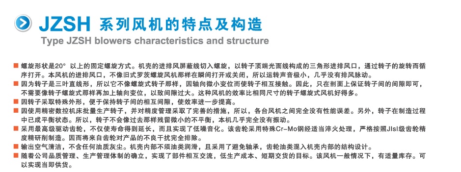 2.JZSH系列風(fēng)機(jī)標(biāo)準(zhǔn)附屬品:電機(jī)、進(jìn)口消音器、出口消音器,風(fēng)機(jī)底座、彈性接頭、安全閥、逆止閥、壓力表、地腳螺栓、風(fēng)口連接螺絲,風(fēng)機(jī)帶輪、電機(jī)帶輪、V型三角帶、皮帶罩、羅茨風(fēng)機(jī)專用油(已注好)。